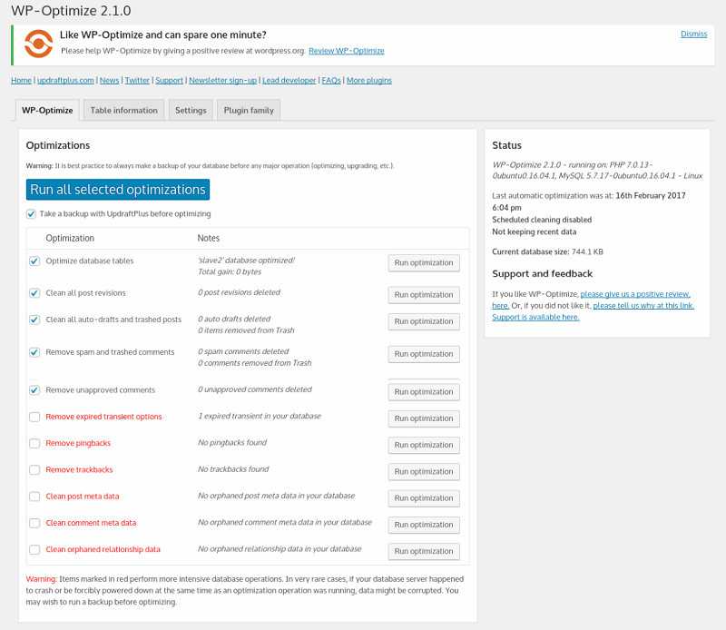 Con el tiempo la base de datos de nuestro WordPress puede saturarse de datos inútiles. Mismamente cuando desinstalamos un plugin pueden quedar restos de código basura en la tabla de OPTIONS de nuestro sitio. A lo largo de los meses trabajando sobre la misma instalación de WordPress, el peso de OPTIONS puede ser demasiado grande y relentizar la carga de la web. WP-Optimize te permite limpiar la base de datos de WordPress y optimizar las tablas.