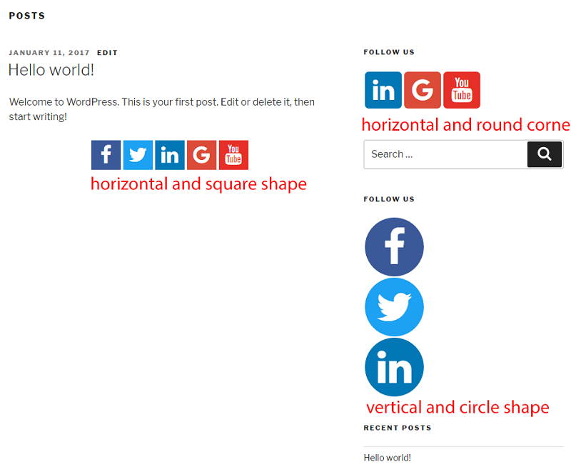 Puedes configurar diferentes estilos y colocar los iconos en sentido vertical u horizontal para adaptarse a la plantilla de tu web. También puedes insertarlos dentro de las páginas o post usando shortcodes.