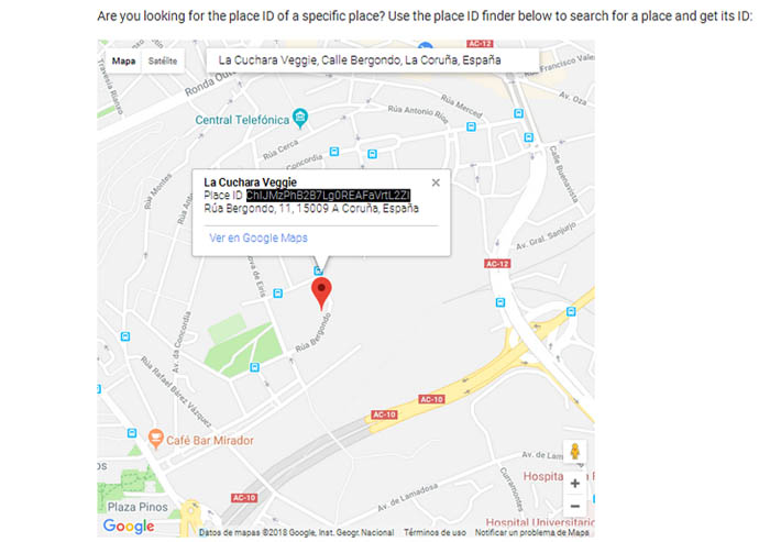 - Crea un link para compartir con tus clientes: dirígete a la Google Places Api e introduce el nombre tu empresa, haz clic en aceptar y obtendrás el ID de tu empresa.