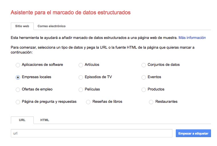 - Utiliza el Asistente para el marcado de datos estructurados de Google y en la pestaña «Sitio Web» selecciona la opción «Empresas locales». Utiliza los datos estructurados para mejorar el posicionamiento local de tu sitio web.