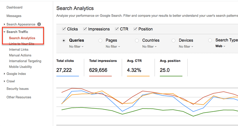 Tomando en cuenta el SEO, una de las funciones más interesantes de Search Console es el «Análisis de búsqueda». Con ella podemos ver el número de consultas (palabras o frases) por los que ha aparecido algún resultado de nuestra web, las impresiones y clics efectuados por los usuarios. En una estrategia orientada al marketing de contenidos comprobaremos las posiciones que van ganando nuestras palabras clave con el paso del tiempo.