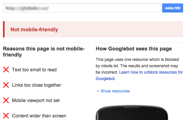 Tan sólo tenemos que ingresar la URL de nuestro sitio y darle clic en «analizar» para que Google nos dé su diagnóstico.